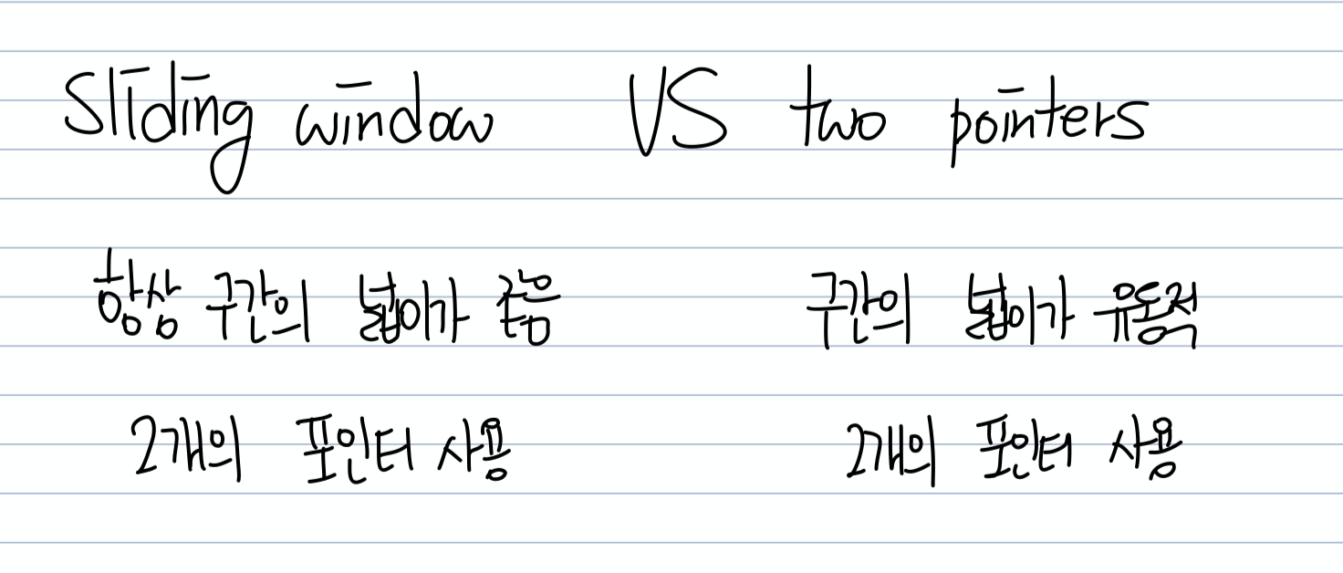 Two pointers는 구간의 넓이가 조건에 따라서 유동적으로 변한다.