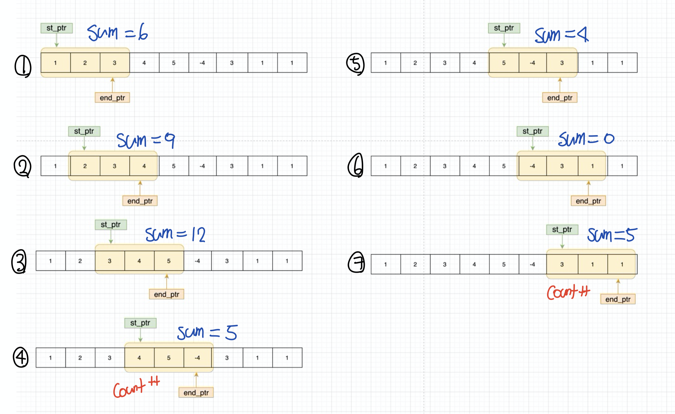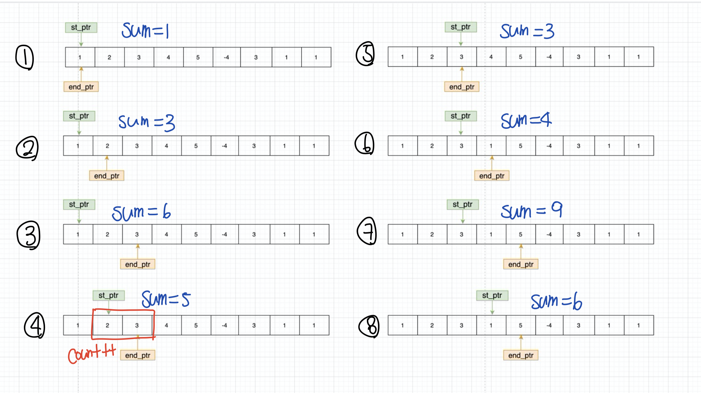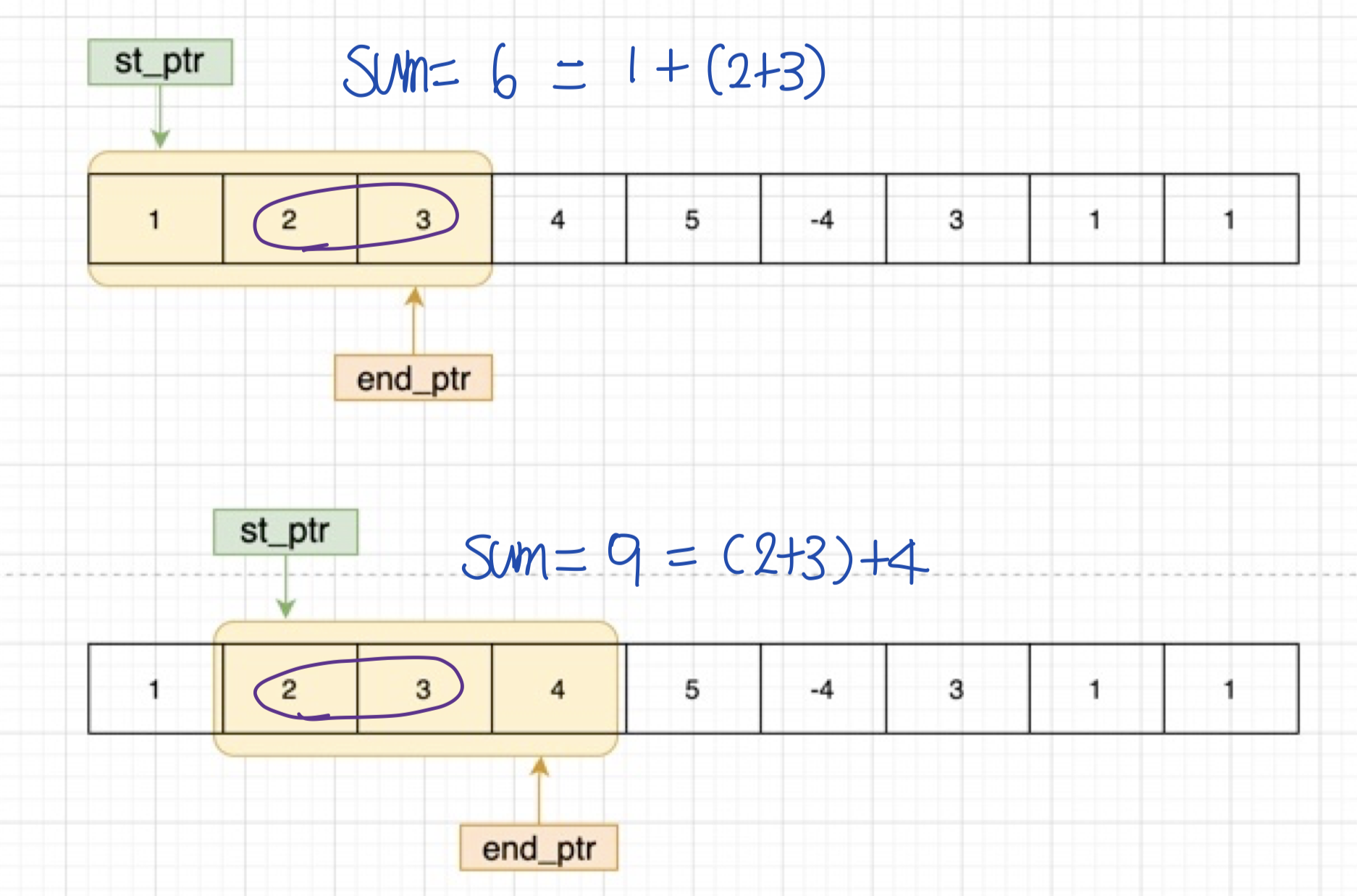 • 만약 구간의 합이 5 이상, 또는 end_ptr 가 배열의 끝에 도달했으면, st_ptr++